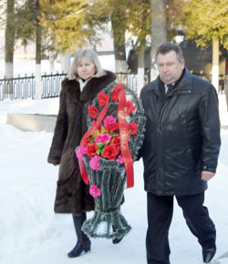 Старшыня раённага выканаўчага камітэта У. П. Куранны і старшыня раённага Савета дэпутатаў І. М. Новікава ўскладваюць да падножжа помніка карзіну з кветкамі (на здымку). Кветкі, як даніну пашаны і ўдзячнасці, нясуць прадстаўнікі працоўных калектываў Шуміліна, жыхары горада.