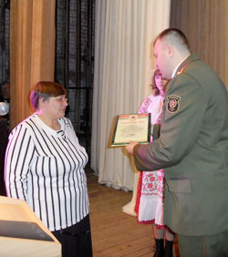 Прыемную місію ўзнагароджвання працягвае старшыня раённай арганізацыі грамадскага аб’яднання “Беларускі саюз афіцэраў” В. І. Жандараў. Грамату савета Віцебскай абласной арганізацыі ГА “Беларускі саюз афіцэраў” Валерый Іванавіч уручае палкоўніку Канстанціну Шынкевічу, маёру Уладзіміру Калеснікаву, капітану Анатолю Зайцаву, капітану Ігару Карнавушчанку.