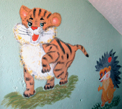 Мы завіталі ў адрамантаваны пад’езд. Сцены, пляцоўкі кожнага паверха тут сапраўды эксклюзіўныя. Пад вокнамі – смяшарыкі з вядомага мульціка, на сценах – кветкі, экзатычныя жывёлы, рыбы, героі вядомых мультфільмаў.