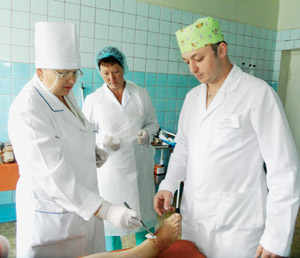 На здымку: урачы Е. П. Бурлакова, А. К. Рудовіч і медсястра Валянціна Дзмітрыеўна Жукава аглядаюць хворую нагу пацыенткі.