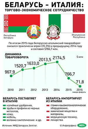 Несмотря на значительное снижение объема белорусско-итальянского товарооборота, в том числе под влиянием внешних экономических факторов, по итогам прошлого года он составил $766,7 млн. В отдельные годы этот показатель превышал $2 млрд. Оборот услугами с Италией в 2015 году составил около $60 млн.