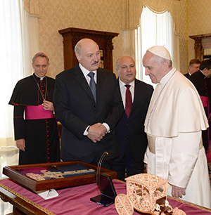 Встреча Александра Лукашенко и понтифика Франциска продолжалась около 40 минут, из них 25 минут Президент и Папа Римский общались в формате «один на один». Встреча проходила в очень теплой и дружественной атмосфере. Уже в присутствии членов официальной делегации стороны обменялись подарками. Глава белорусского государства преподнес в дар понтифику копию креста Евфросинии Полоцкой, выполненную с помощью уникальной техники резьбы по дереву, модель кареты, сделанную по этой же технологии, а также голографическую икону. Как отметил Президент, эта икона соединяет в себе историю и современность.