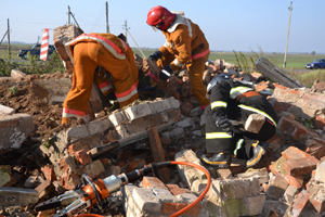 Шумілінскія выратавальнікі тым часам актыўна шукаюць у развалінах іншых ахвяр здарэння і вызваляюць іх з-пад завалаў. Будаўнікі з дапамогай крана прыступаюць да разбору разбуранага даху, абразаюць і складваюць пліты перакрыццяў на трал. Трэба сказаць, што работа не такая простая і ў звычайных умовах, а калі ведаеш, што гэта экзамен, які трэба здаць аператыўна і якасна… Тым больш, што за дзеяннямі ўсіх службаў уважліва назіраюць пасрэднікі і кіраўніцтва вучэнняў.