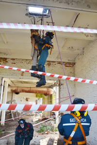 Складанае заданне дасталася супрацоўнікам “Віцязя”, якія адначасова з ліквідацыяй радыеактыўнай крыніцы прыступілі да выратавання пацярпеўшага, які знаходзіцца ў ізаляваным памяшканні. Праз дах, у якім з дапамогай моцнага інструменту робіцца адтуліна, у памяшканне спускаюцца выратавальнікі, вызваляюць пацярпеўшага з-пад завалу і аказваюць першую медыцынскую дапамогу. З дапамогай спецыяльных прыстасаванняў выцягваюць яго наверх, спускаюць з даху на насілках і дастаўляюць да медыкаў.