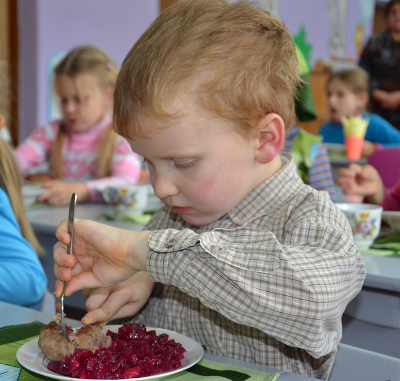 Яшчэ ў садку вялікую ўвагу надаюць эстэтыцы харчавання: на здымку бачна, як выдатна малыя спраўляюцца з катлетай з дапамогай нажа і відэльца. Цікава, што ў меню бацькі знойдуць і прапановы пра тое, чым можна пакарміць дзіця ў вечары.