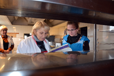 Святлана Лузгіна ўзяла на сябе абавязкі шэф-повара Обальскай школы зусім нядаўна, таму госці ў выглядзе карэспандэнта і спецыялістаў аддзела адукацыі, якія з’явіліся на яе кухні, крыху збянтэжылі жанчыну. У гэты час на пліце гатаваўся малочны суп з макаронай, у спецыяльным тазіку стаяў прыгатаваны для тэфтэляў з соусам паўфабрыкат з фаршу. Тэхнолаг Алена Ходзюш адразу ж узялася правяраць выхад фаршу. Адбываецца гэта прыкладна так: спачатку фарш узважваецца, затым з яго лепяцца тэфтэлі ці катлеты аднолькавага памеру і формы, якія гатуюцца, а затым зноў узважваюцца. Калі на нейкай стадыі прыгатавання была дапушчана