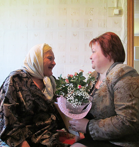 Вось і напярэдадні Дня Перамогі прафсаюзны лідар Ірына Іванова разам з начальнікам аддзела па кадрава-прававой і ідэалагічнай рабоце Святланай Мацвеевай з кветкамі і грашовымі падарункамі завіталі да сваіх ветэранаў – Ніны Аляксандраўны Занкевіч і Надзеі Андрэеўны Сцепанец. Гэтыя жанчыны ў час вайны былі сасланы немцамі на прымусовыя сельскагаспадарчыя работы.