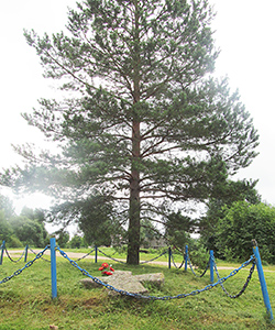 Помню, як у 80-ыя гады ля гэтага каменнага крыжа ў Мішневічах стаяла векавая сасна. А потым побач з ёй вырасла маленькая сасёнка. Чыісьці клапатлівыя рукі абгарадзілі яе, падвязалі. Ішоў час, паступова старая сасна звалілася долу, а маладая набірае моцы і сілы.