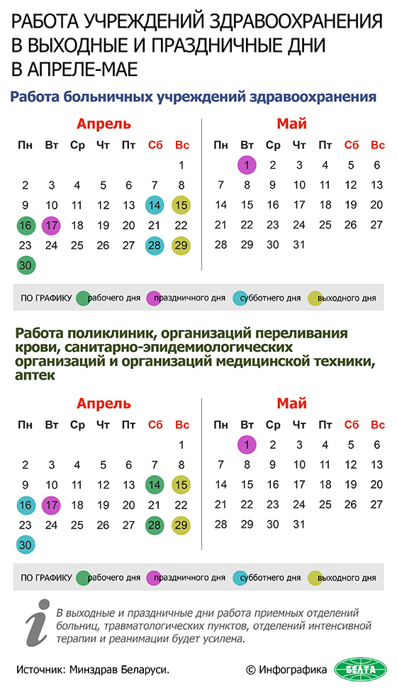В выходные и праздничный день амбулаторно-поликлинические учреждения, приемные отделения больниц, травматологические пункты, отделения интенсивной терапии и реанимации будут усилены наиболее квалифицированными специалистами. Из числа руководящего состава организуют административные дежурства в управлениях здравоохранения облисполкомов, комитете по здравоохранению Мингорисполкома, а также подчиненных организациях здравоохранения и на дому.-0-