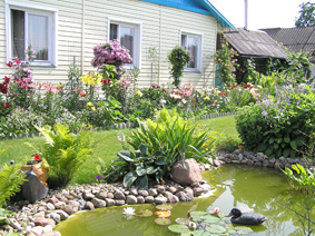 – Безумоўна, праглядаем спецыяльныя часопісы, але творым так, як нам бачыцца. Напрыклад, перш чым вадаём набыў такі выгляд, не раз прымерылі, каб кожны камень, вадаспад, кожная расліна і скульптурка знайшлі сваё месца”, – прызналася гаспадыня.