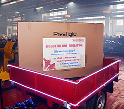 Пад выбухі навагодніх феерверкаў на міні-трактары, у чароўнасці якога сумнявацца не прыходзілася, у цэх заехаў галоўны Дзед Мароз, а за ім больш за трыццаць навагодніх пар, Дзедаў Марозаў і Снягурак, – работнікі завода з радасцю ўзялі на сябе гэтыя ролі, каб парадаваць дзяцей. Кожны гімназіст атрымаў падарунак – цукеркі і зімовыя наборы ад МТЗ – шапачку, рукавічкі і шалік з лагатыпам завода. Тут адразу варта заўважыць, што такія ж падарункі атрымалі і тыя дзеткі вучэбнай установы, якія ў Мінск не патрапілі.