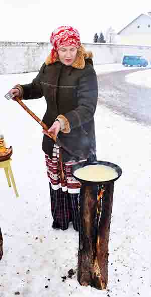 Выпякаліся яны і непасрэдна на гулянні. Прычым, на адмысловых паленах. Выглядала гэта вельмі смачна і прывабна. І жадаючых паласавацца такімі блінамі, як кажуць, з пылу з жару, было хоць адбаўляй.