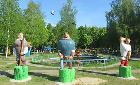 Ілью Мурамца, Алёшу Паповіча і Дабрыню Мікіціча, што “прапісаліся непадалёк ад горкі, выразаў з дрэва муляр участка дрэваапрацоўкі УП ЖКГ Аляксандр Сіпко. Тры асілкі сталі даволі папулярным фонам для сэлфі і фотаздымкаў не толькі малых, але і дарослых.