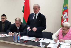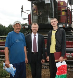 З намалотам у тысячу тон кіраўнік раёна Вальдэмар Антонавіч Падляшчук віншаваў учора перадавых камбайнераў ААТ “Прыазёрны мір” — Мікалая Карнілава і экіпаж Аляксандра Іванова — Яўгена Кузняцова.