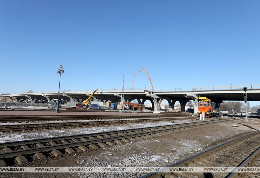 Непривычно теплая зима способствует строительству моста. К монтажу железобетонных балок (одна весит около 40 т) над путями удалось приступить на 2-3 недели раньше планируемых сроков. В сторону улицы Ленинградской пролетные строения уже соединены. «Осталось замкнуть два пролета съезда на улицу Титова. Планируем в марте завершить монтаж всех пролетных строений моста», — отметил заместитель директора филиала МСУ №5 ОАО «Мостострой» Александр Максимович.