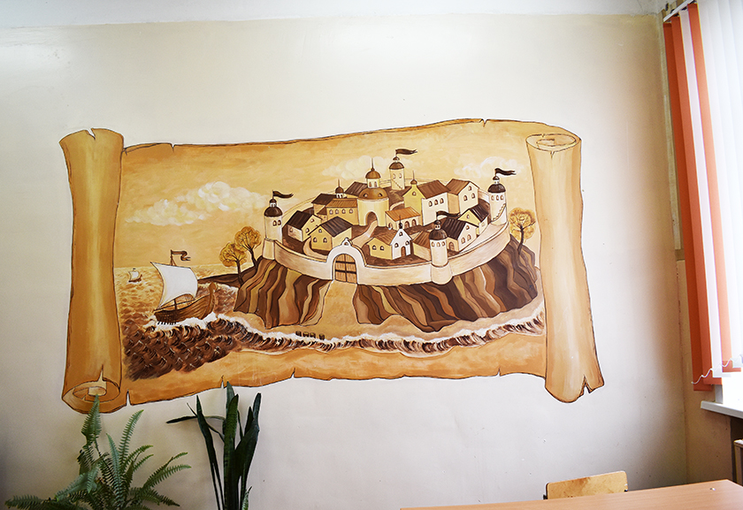 А вось кабінет гісторыі, сцяну якога ўпрыгожвае старадаўні папірус з выявай горада-крэпасці і падплываючых да яго паруснікаў.