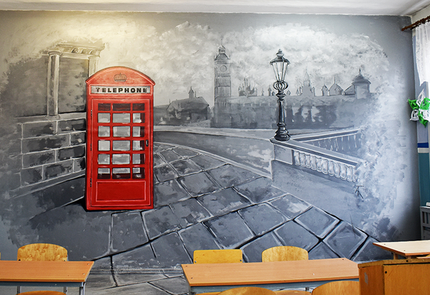 А гэта ўжо кабінет англійскай мовы – на ўсю сцяну знакаміты лонданскі пейзаж: у туманнай дымцы брукаваная вуліца з ліхтарамі, а на пярэднім плане, на манахромным чорна-белым фоне яркая чырвоная тэлефонная будка.