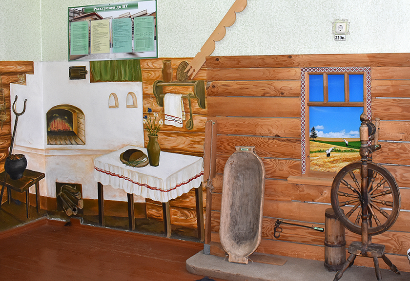 Вось кабінет беларускай мовы з партрэтамі класікаў Якуба Коласа і Янкі Купалы, з беларускім хатнім рыштункам – начоўкамі, калаўротам. Тут жа ўдала ўпісаўся намаляваны куток сялянскай хаты са сталом пад белым абрусам, з ручніком на сцяне, з печкай, у якой палае агонь.