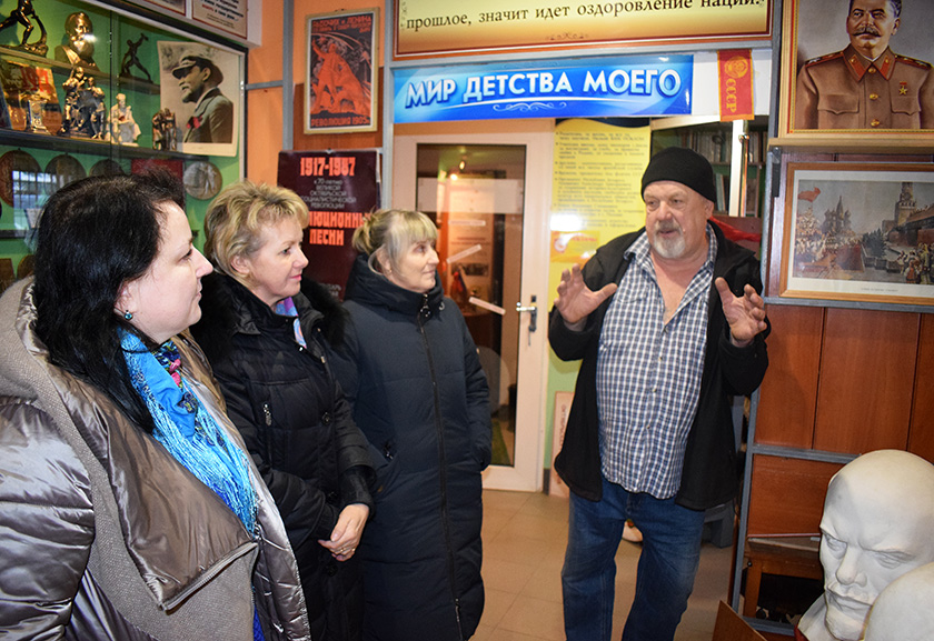 Мікалай Панкрат праводзіць экскурсію па сваім музеі «Сэнс жыцця» для работнікаў Шумілінскай бібліятэчнай сістэмы