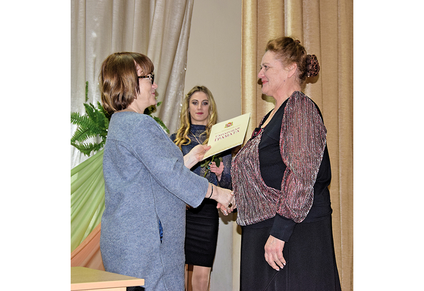 Старшыня раённага Савета дэпутатаў Ірына Новікава ўручае Ганаровую грамату раённага выканаўчага камітэта Ганне Каламіец, загадчыку аддзела народнай творчасці РЦК.