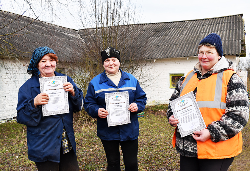 Дабейскіх жывёлаводаў Наталлю Літвін, Вольгу Маліноўскую і Ларысу Васілеўскую (на здымку) з лепшымі ў раёне надоямі і прывагамі павіншавалі намеснік дырэктара па вытворчасці ААТ «Прыазёрны мір» Марына Панкраценка і старшыня райкама прафсаюза работнікаў АПК Вольга Пусянкова. За працоўныя здабыткі жанчыны атрымалі ад прафсаюза падзякі і прэміі.