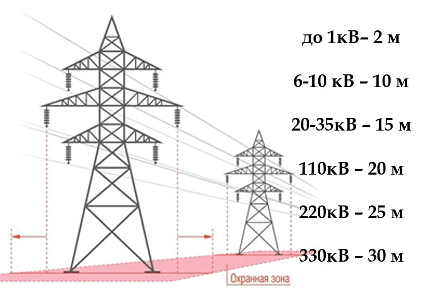 Охранные зоны электрических сетей устанавливаются вдоль воздушных линий электропередачи в виде земельного участка и воздушного пространства, ограниченных вертикальными плоскостями, отстоящими по обе стороны линии от крайних проводов при неотклоненном их положении на расстоянии (см рисунок).