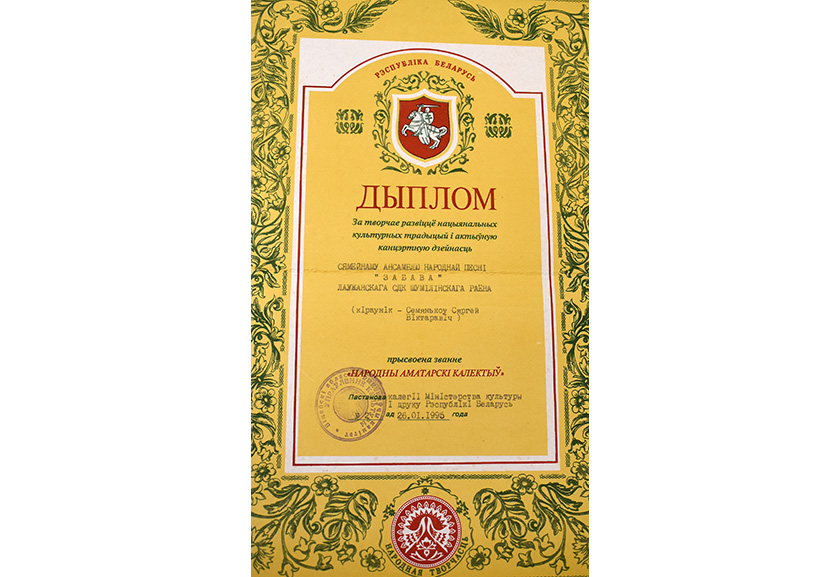 Вось той самы дакумент аб прысваенні калектыву звання «народны», датаваны 26 студзеня 1995 года . У ім адзначана, што дыплом і званне «Забава» атрымала за творчае развіццё нацыянальных культурных традыцый і актыўную канцэртную дзейнасць.