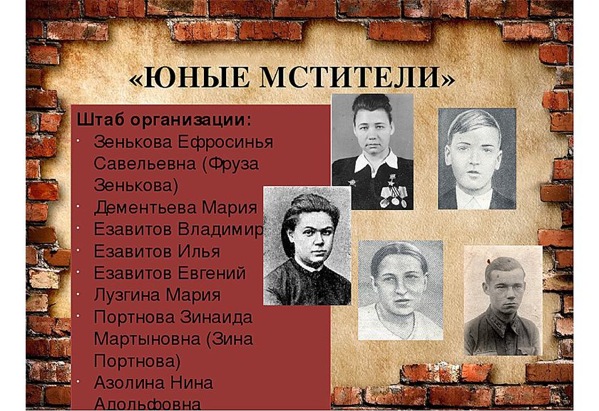 Кіруючае ядро складалі Фруза Зянькова, Марыя Дзяменцьева, Уладзімір, Ілья і Яўген Езавітавы, Марыя Лузгіна, Зіна Партнова, Ніна Азоліна, Валянціна Шашкова. Усе юныя падпольшчыкі былі залічаны ў партызанскі атрад імя Варашылава.