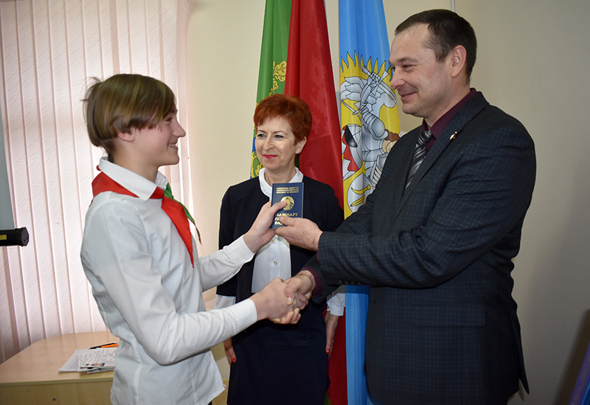 Мікалай Будневіч і Алена Пракоф’ева ўручаюць пашпарт вучню Слабадской школы Паўлу Шапрунову.