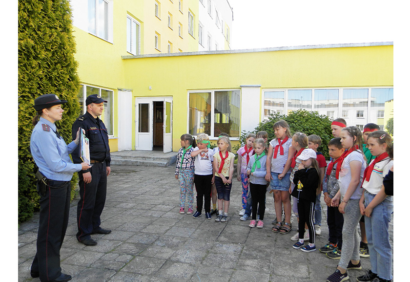 Падчас нашага прыезду старшы інспектар інспекцыі па справах непаўналетніх Алена Селязнёва і старшы ўчастковы інспектар Дзмітрый Зубараў праводзілі з дзецьмі віктарыну «Не забудзь пра бяспеку». Яны нагадалі пра бяспечныя паводзіны на вадзе, пра важнасць захавання Правілаў дарожнага руху, пра тое, што самастойна катацца на веласіпедзе без нагляду дарослых можна толькі з 14 гадоў. Алена Селязнёва расказала пра выпадак у раёне, калі ў нежылым доме ў Грудзінаве дзеці падпалілі кардон, каб разагнаць камароў, а ў выніку згарэў увесь дом. Супрацоўнікі міліцыі пераконвалі дзяцей, што бяспека і асцярожнасць – гэта вельмі важна. Ад гэтага часам залежыць не толькі здароўе, але і жыццё.