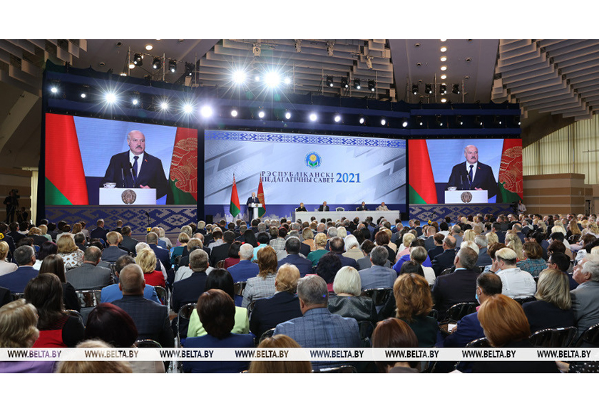 «Как понимают и то, что гражданская и жизненная позиция педагога, его участие в общественной или политической жизни страны — это пример, на котором воспитываются не только ученики, но и учителя. Школа воспитывает не только учеников, но и перевоспитывает многих родителей. Ведь мы с вами прекрасно знаем, что любые фундаментальные знания должны подтверждаться примерами из жизни. В общении с детьми не избежать анализа событий прошлого и настоящего, их оценки с позиции интересов государства, в котором живем. Что это, если не политика?» — спросил белорусский лидер.