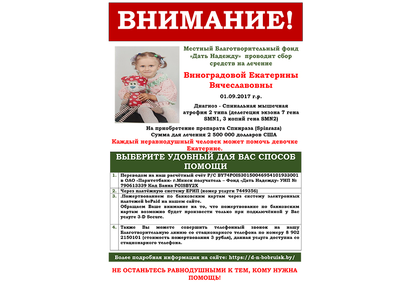 Благотворительный фонд «Дать надежду» проводит сбор средств на лечение Виноградовой Екатерины