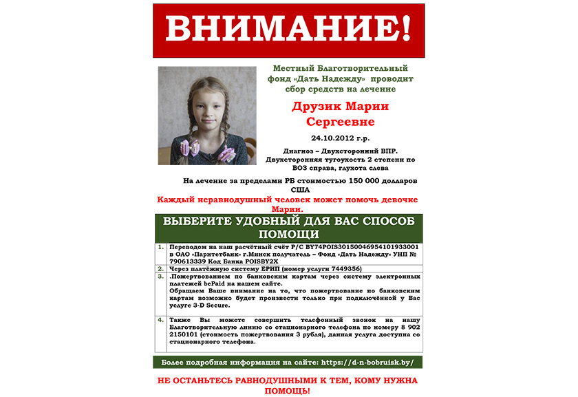 Благотворительный фонд «Дать надежду» проводит сбор средств на лечение Друзик Марии