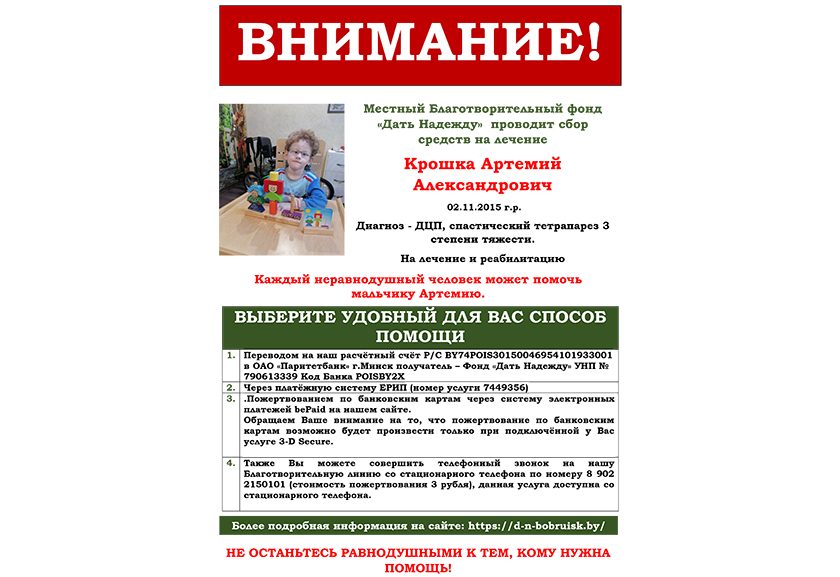 Благотворительный фонд «Дать надежду» проводит сбор средств на лечение Крошка Артемия