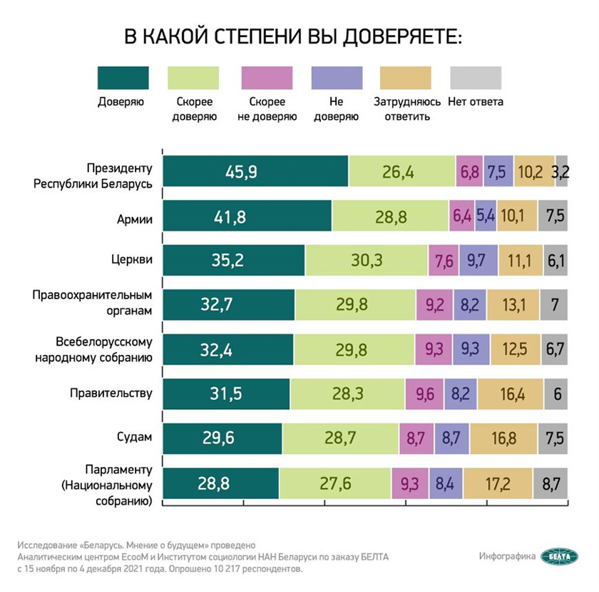 Уровень доверия иным государственным и общественным институтам выглядит следующим образом: армии — 70,6%, церкви — 65,5%, правоохранительным органам — 62,5%, правительству — 59,8%, судам — 58,3%, парламенту (Национальному собранию Республики Беларусь) — 56,4%.