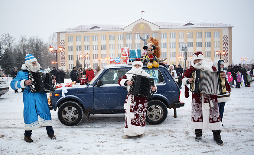 У навагоднія касцюмы пераапрануліся настаўнікі і ўрачы, дарожнікі і будаўнікі, газавікі, камунальнікі, прадстаўнікі іншых прафесій. Яны спявалі, танцавалі, гралі на гармоніках, чыталі вершы, загадвалі загадкі, вадзілі карагоды – шчыра выконвалі свае ролі. Некаторыя прыбылі да галоўнай ёлкі на чароўных навагодніх аўто!