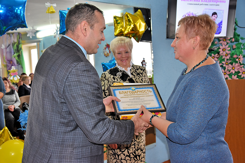 Паставіў самую высокую адзнаку рабоце раённай сацыяльнай службы старшыня райсавета Мікалай Будневіч. Ён падзякаваў сацыяльным работнікам за сардэчнасць, разуменне і годнае выкананне службовых абавязкаў і ўручыў Ганаровую грамату райвыканкама сацыяльнаму работніку Кацярыне Калашнік. Падзяку старшыні райвыканкама атрымала сацыяльны работнік Валянціна Акуцёнак.
