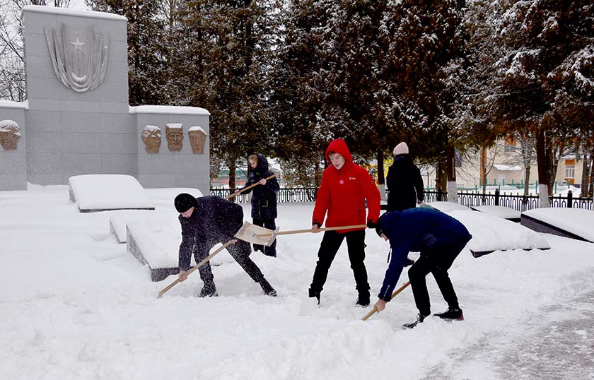 Вучні Шумілінскай СШ №1 пасля моцных снегападаў, што прайшлі ў канцы мінулага тыдня, дапамагаюць расчышчаць ад снегу Алею Герояў, брацкія могілкі і помнік воінам-інтэрнацыяналістам, якія знаходзяцца ў гарадскім парку ў Шуміліне.