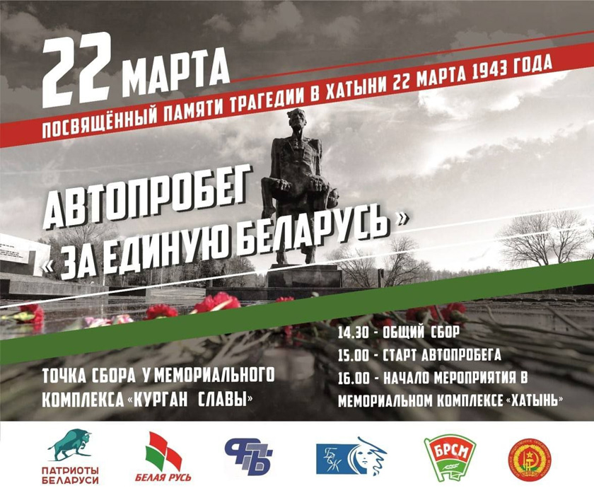 22 марта пройдёт автопробег «За единую Беларусь», посвящённый памяти трагедии в Хатыни 22 марта 1943 года.