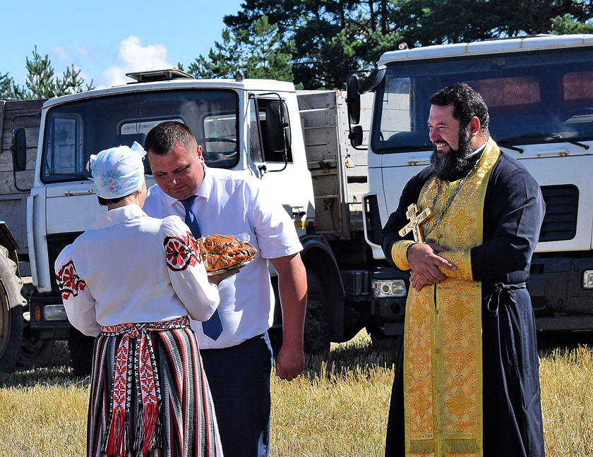 Павіншаваў усіх з зажынкамі, прачытаў малітву на добрую работу, акрапіў тэхніку і механізатараў святой вадой настаяцель храма Святога прападобнага Ануфрыя Вялікага Уладзімір Пучынскі.