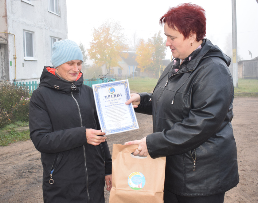 З перамогай у працоўных спаборніцтвах аператара фермы Заобаль падарункамі і падзякай павіншавала старшыня райкама прафсаюза работнікаў аграпрамысловага комплексу Вольга Пусянкова.