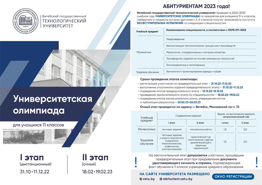 Витебский государственный технологический университет проводит в 2022/2023 учебном году университетские олимпиады по предметам для учащихся 11 классов. Победители и лауреаты олимпиад (дипломы I, II и III степени) получают возможность поступить без вступительных испытаний по следующим предметам: