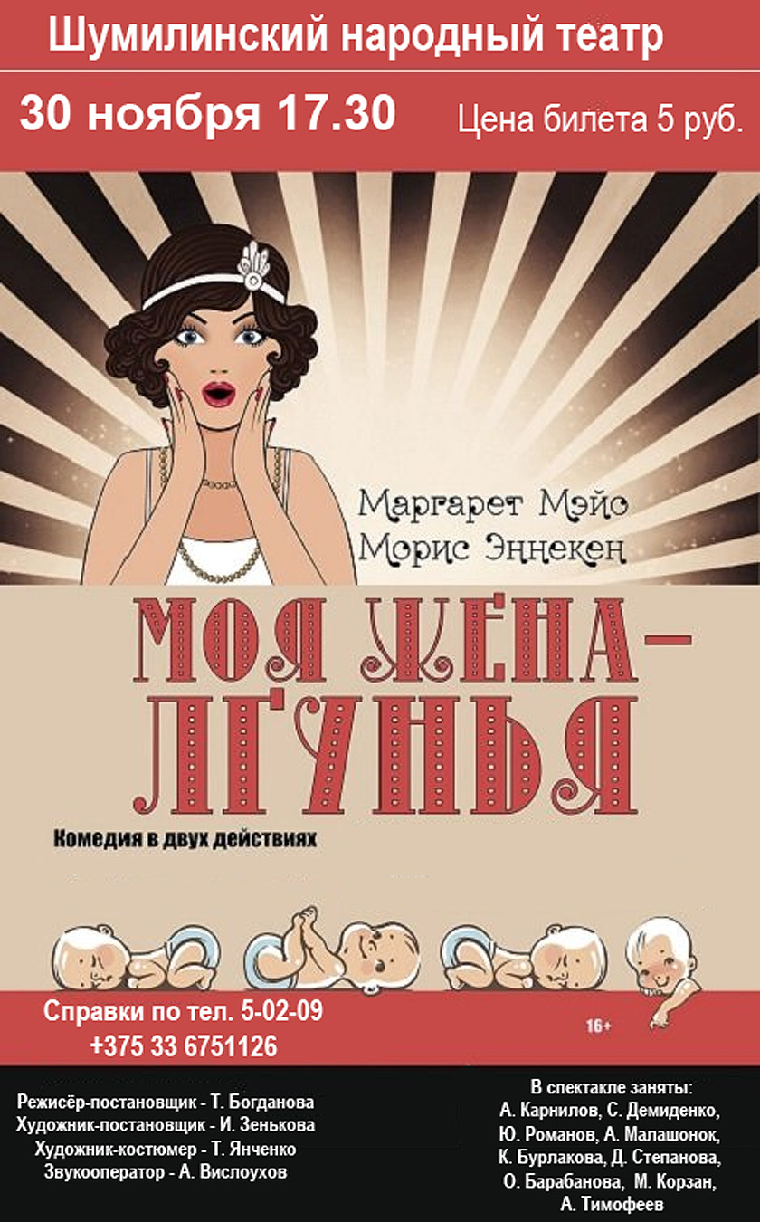 30 ноября, 17.30 — премьера Шумилинского народного театра — комедия «Моя жена — лгунья»