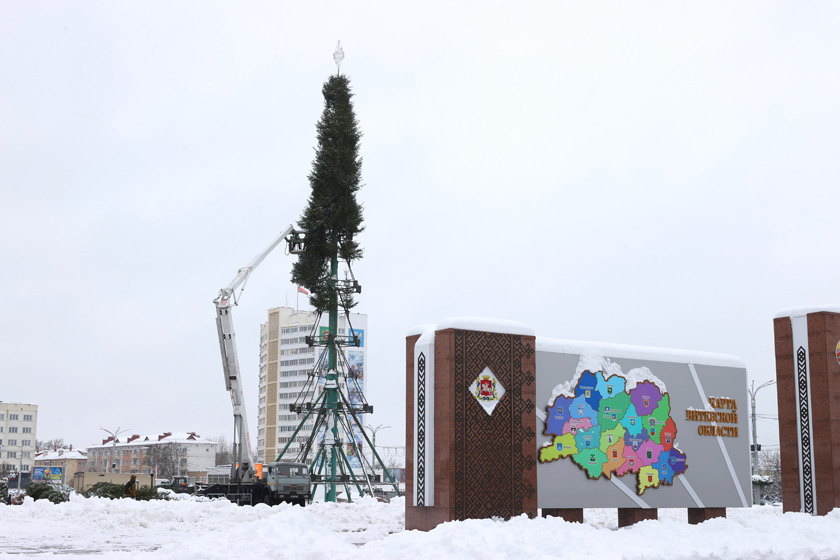 Монтаж главной новогодней елки идет на площади Победы в Витебске. Ее высота составит более 30 метров. В оформлении планируют использовать около 200 елей.На снимке: во время монтажа новогодней елки.Фото Александра Хитрова, БЕЛТА.