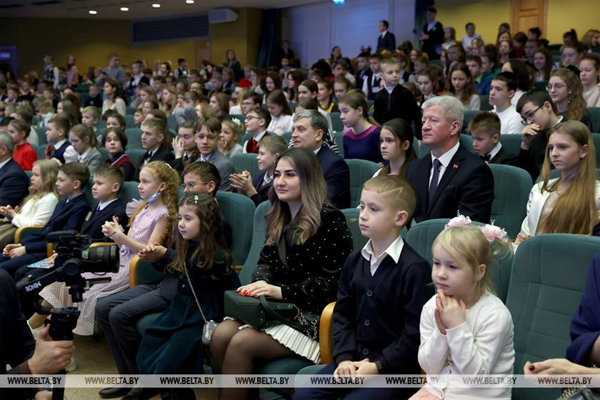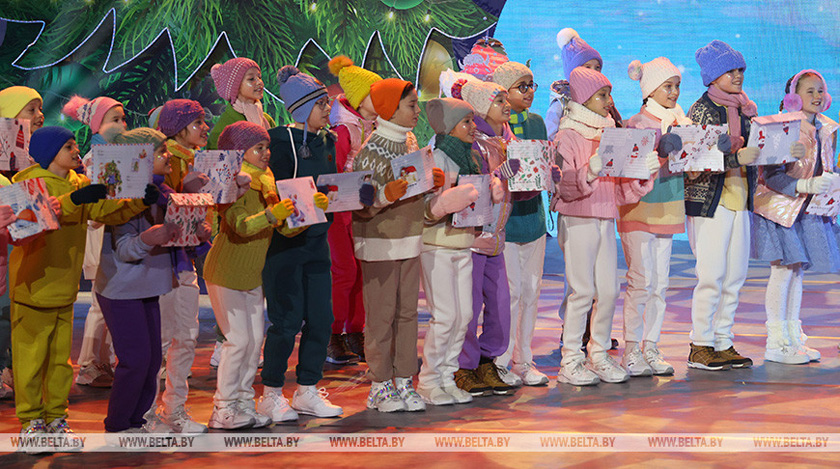 «От всего сердца еще раз поздравляю всех вас, маленьких и уже взрослых — будущее нашей Беларуси, ваших педагогов, воспитателей, учителей, ваших родителей с Новым годом! Я желаю вам отличного настроения, крепкого здоровья и, самое главное, успехов в учебе. Учеба для вас — главнейшая задача на этом этапе вашей жизни. А сейчас с большим удовольствием уступаю эту сцену нашим хозяевам — Деду Морозу и Снегурочке», — сказал белорусский лидер.
