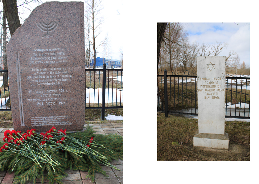 «Ахвярам нацызму. Тут 19 лістапада 1941 года былі па-зверску расстраляны 376 яўрэяў мястэчка Шуміліна» – на беларускай, англійскай і яўрэйскай (іўрыце) мовах напісана на абеліску, устаноўленым на брацкай магіле.