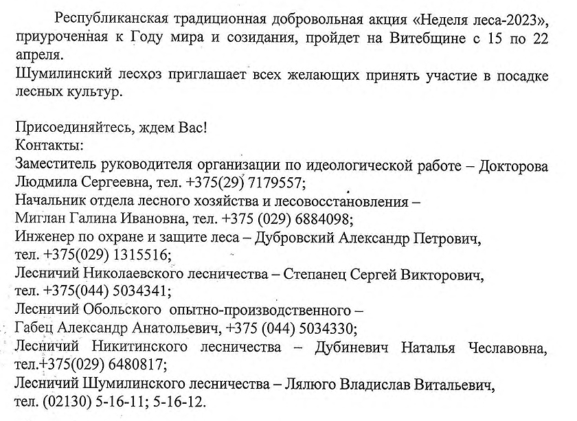 Шумилинский лесхоз предлагает всем принять участие в республиканской акции «Неделя леса-2023», которая проходит на Витебщине 15-22 апреля
