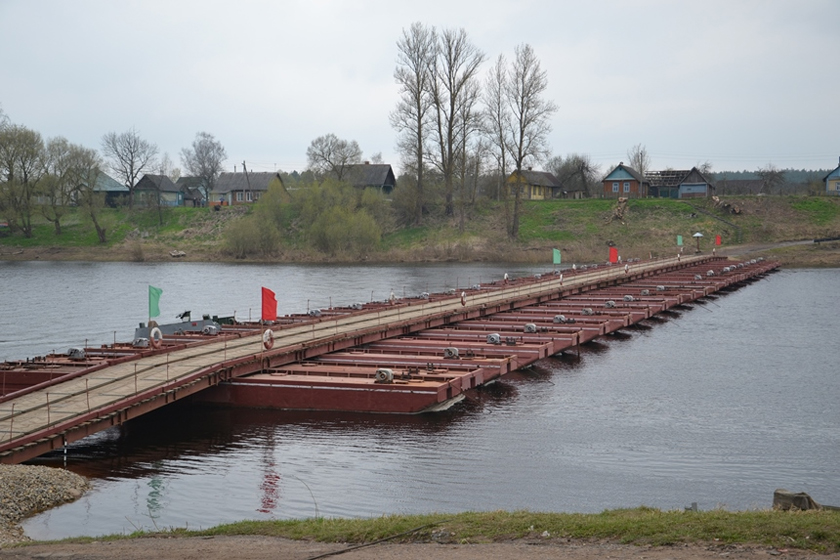 Подобную переправу военные железнодорожники понтонно-мостовой роты мобильно-восстановительного железнодорожного батальона 30-й отдельной железнодорожной бригады наводят здесь ежегодно. Сооружение поможет местным жителям комфортно переправляться с одного берега на другой. Сейчас им приходится использовать лодочный транспорт или объездную дорогу.
