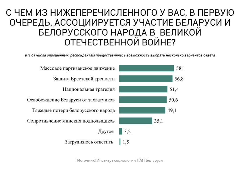 «Массовое партизанское движение» — так ответили 58,1% опрошенных, «Защита Брестской крепости» — 56,8%, «Национальная трагедия» — 51,4%, «Освобождение Беларуси от захватчиков» — 50,6%, «Тяжелые потери белорусского народа» — 49,1%, «Сопротивление минских подпольщиков» — 35,1% респондентов. Затруднились ответить — всего 1,5% респондентов.