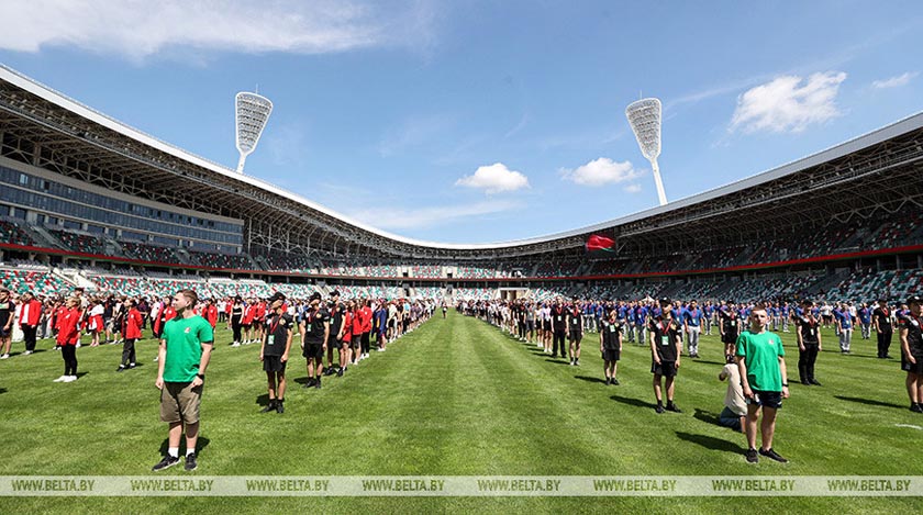 После символической разминки участники выстроились на «Народную зарядку», которую провели мастер спорта международного класса по каратэ (обладатель черного пояса), чемпион мира и Европы, председатель Белорусской федерации каратэ, министр антимонопольного регулирования и торговли Алексей Богданов, мастер спорта международного класса по легкой атлетике, призер чемпионата мира и Европы, II Европейских игр 2019 в Минске Анастасия Мирончик-Иванова, первый секретарь Центрального комитета БРСМ Александр Лукьянов.